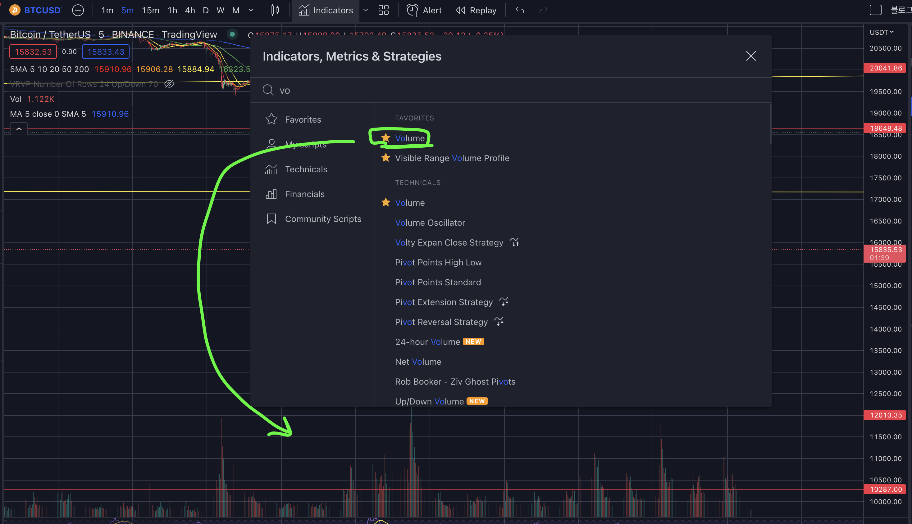 1번 설정에서 Volume(거래량)을 설정해주시고 클릭하면 아래쪽에 거래량이 표시되는 것을 볼 수 있습니다.