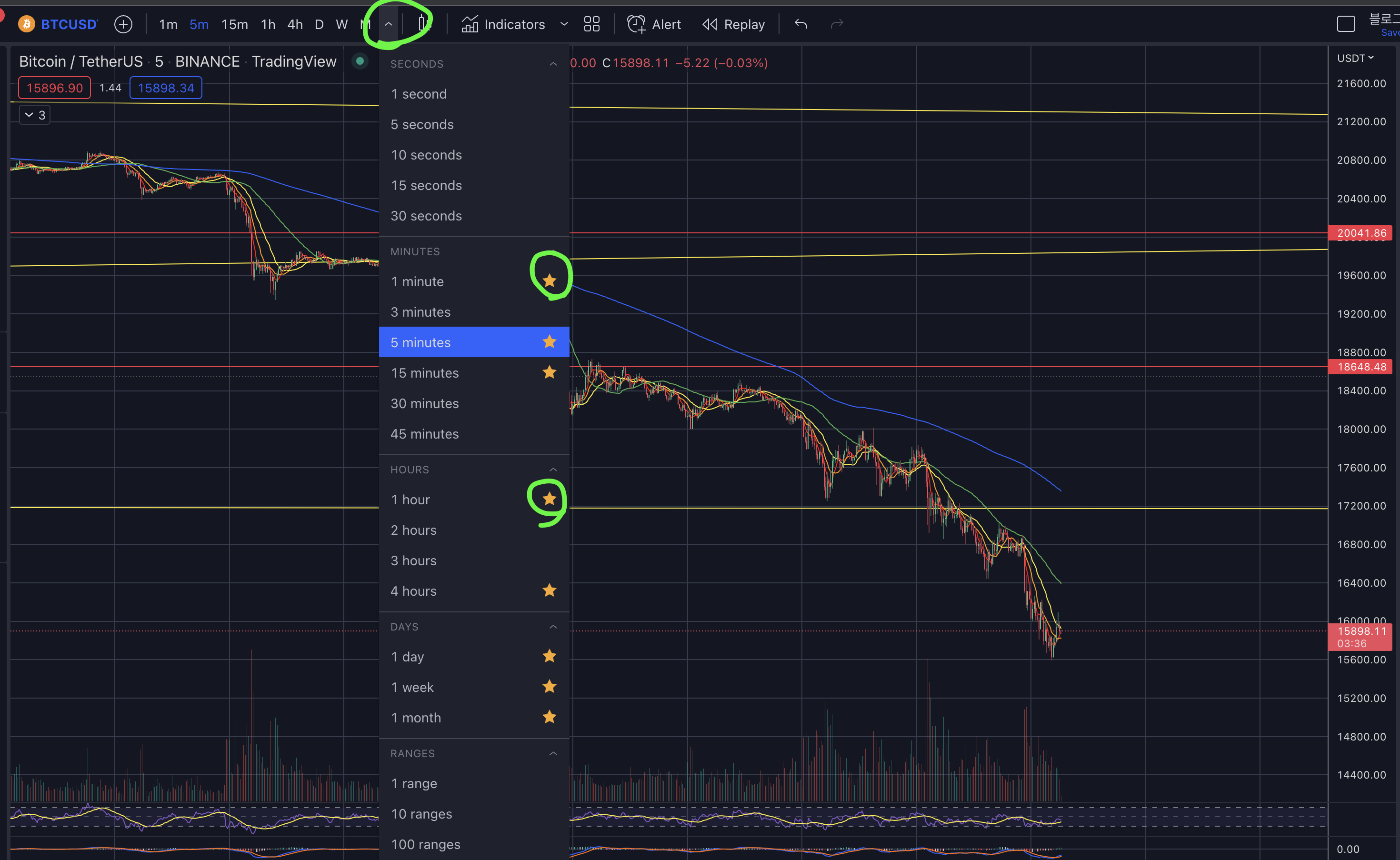차트의 위쪽에 보면 1분봉,5분봉등의 옆에 드랍박스 아이콘을 클릭하면 1초부터 1달 그리고 Range 형태로 선택할 수 있습니다.