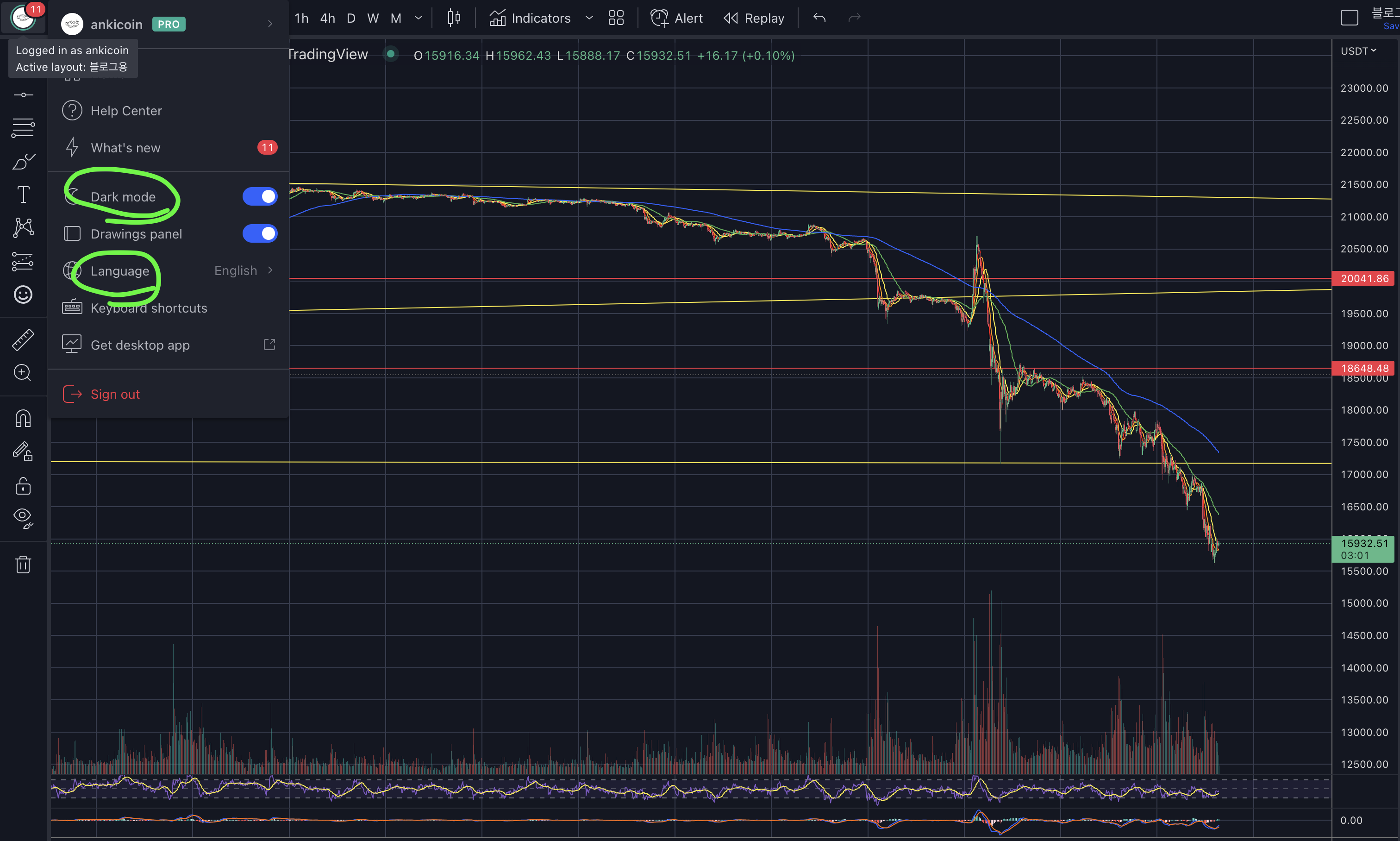 언어도 설정이 가능하고 영어 한국어 설정이 가능합니다.(거래소안에 탑재되어 있는 트레이딩뷰는 언어지원이 다를 수 있습니다.)