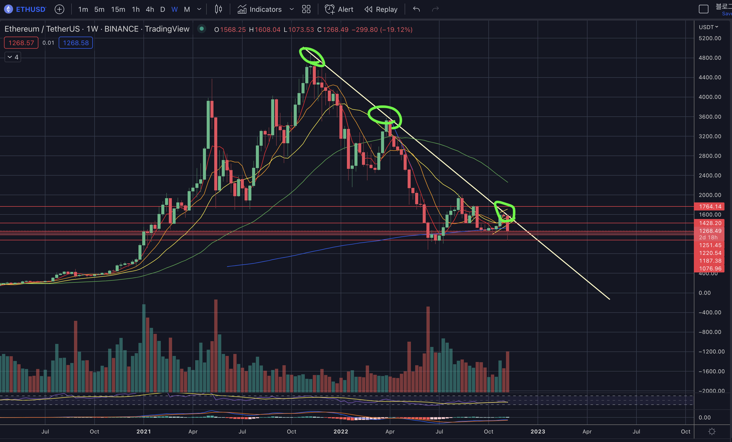 다음은 이더리움 현물의 주봉차트입니다. (11월 11일 기준)