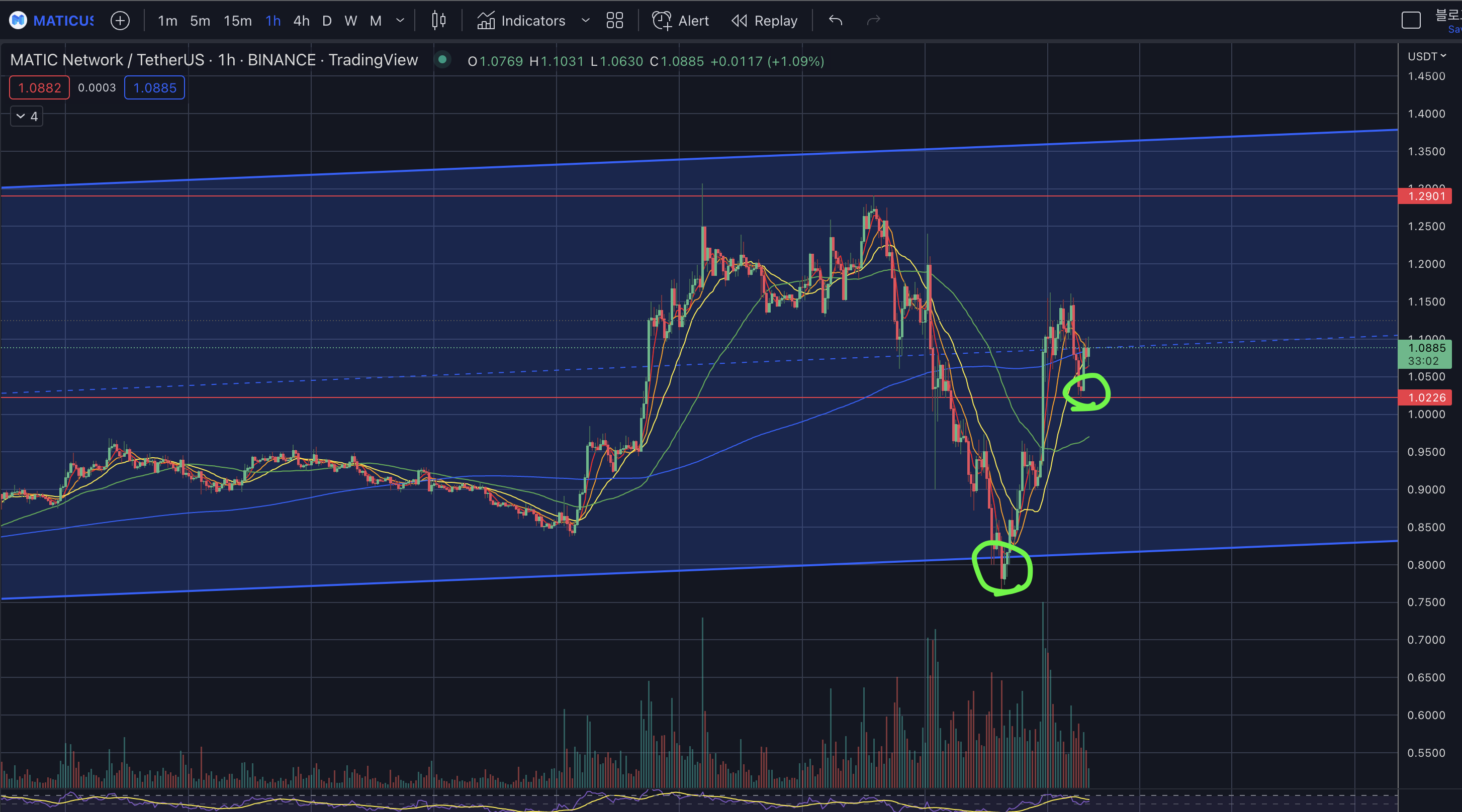 - 두번째 빨간색라인 1.02은 지지선이기 때문에 15분봉 마감을 보면서 반등을 꽤할 수 있는 자리이다.