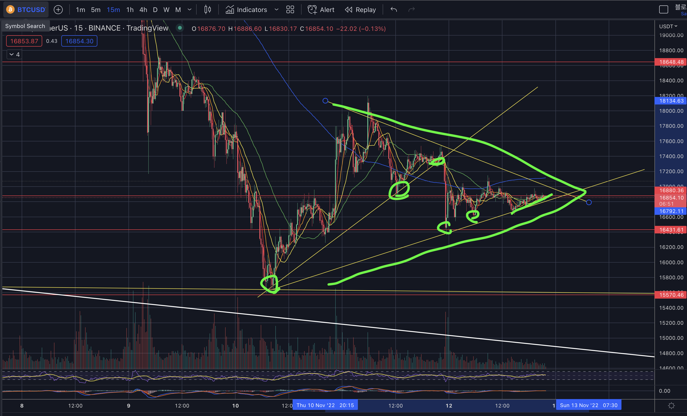 - 16.4k부근이 단기 저항대고 현재는 짧게 삼각수렴패턴이나 조금더 길어질 수 있습니다.