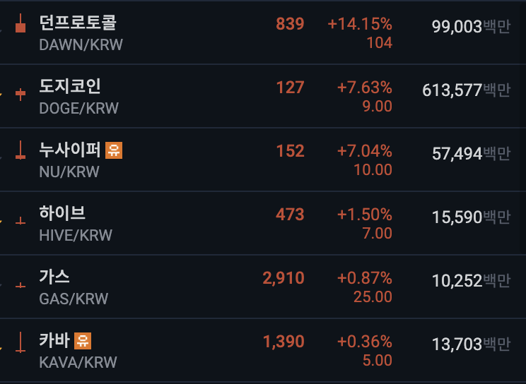 - 던프로토콜, 도지코인, 누사이퍼가 흐름이 좋다.