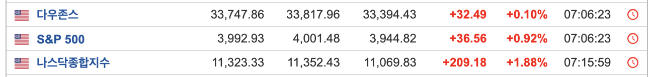 - CPI 지수 영향으로 상승랠리를 이어가며 3대지수 모두 상승하면서 마무리 되었습니다.