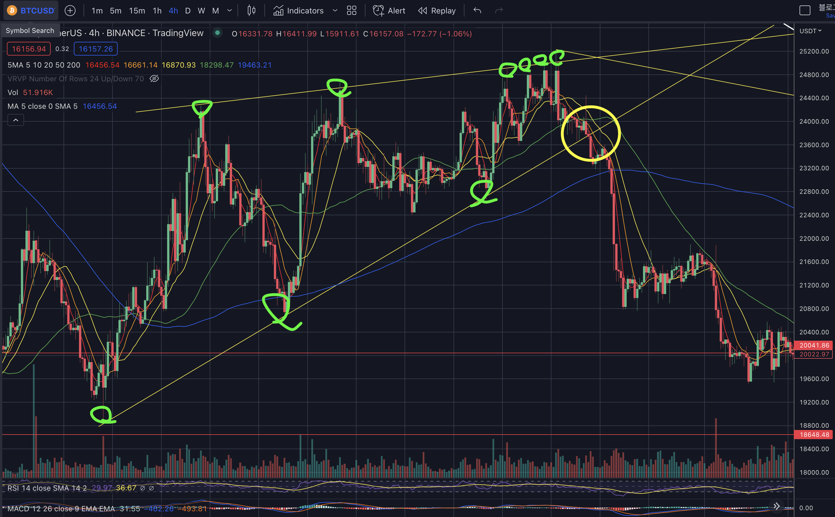 - 15.5k : 전저점은 저항이 될 수 있기 때문에 저항선 설정을 하고, 쌍바닥을 찍고 올라갈 수 도 있고 깰수 있다. 깨게 되면 다음 저지대인 12k까지 갈수 있다.