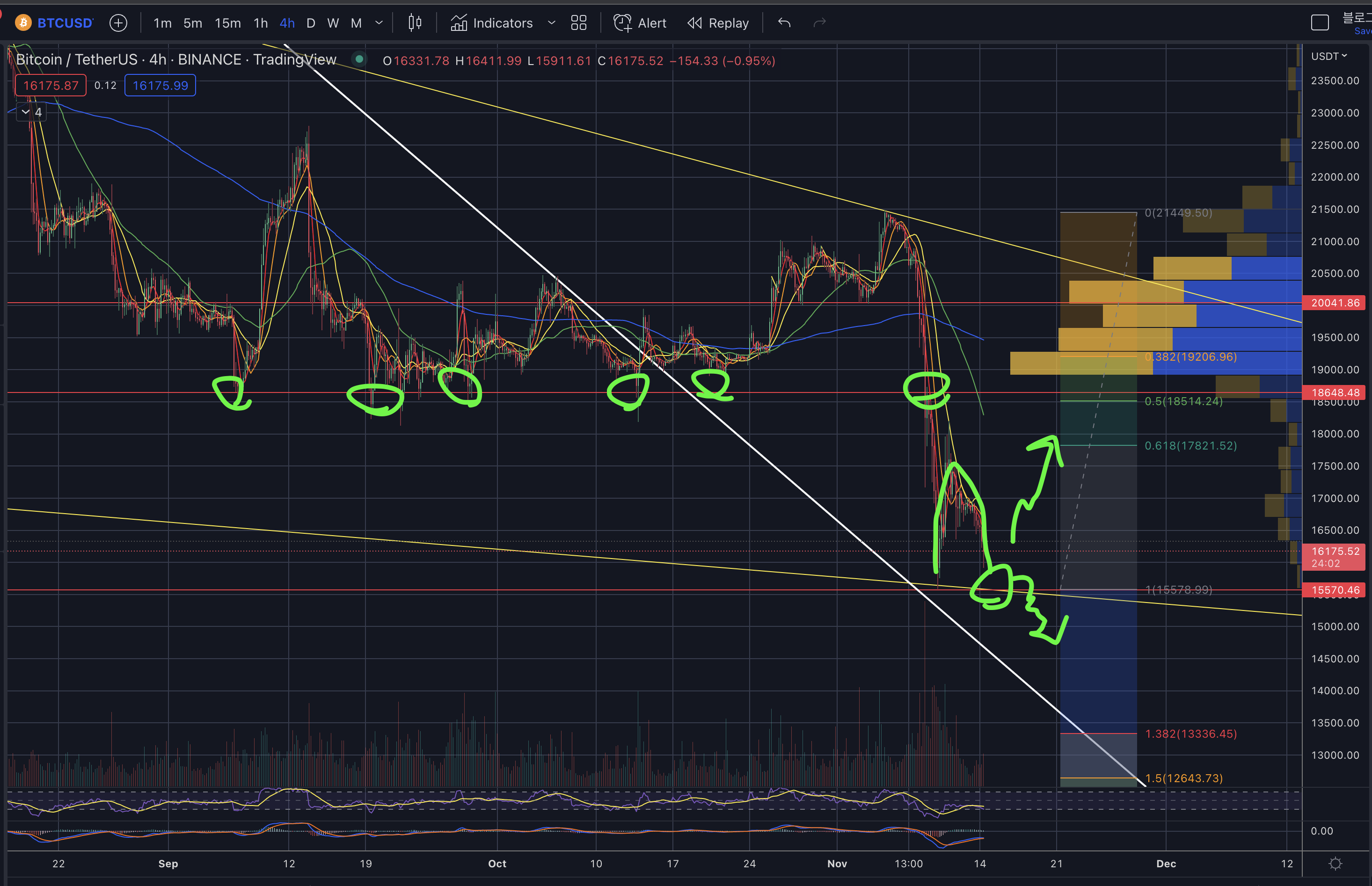 - 현재 보시는 차트는 11월 14일 기준 4시간 봉입니다. 현재 기준으로는 15.5k가 쌍바닥을 형성하려고 하고 있습니다.