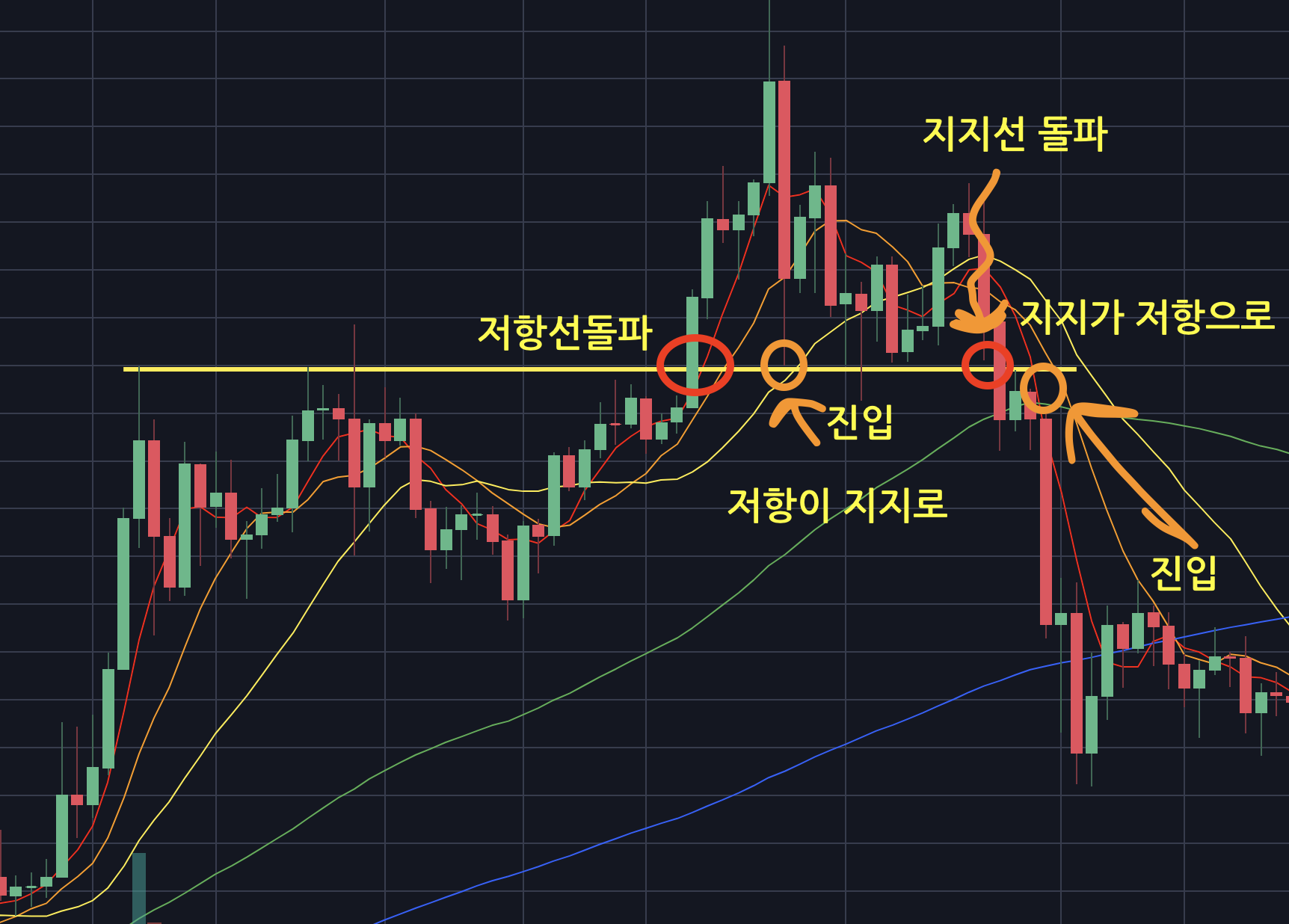 그 뒤로 노란색 라인은 지지를 하다가 강하게 매물대를 돌파하여 지지선을 뚫어냅니다.