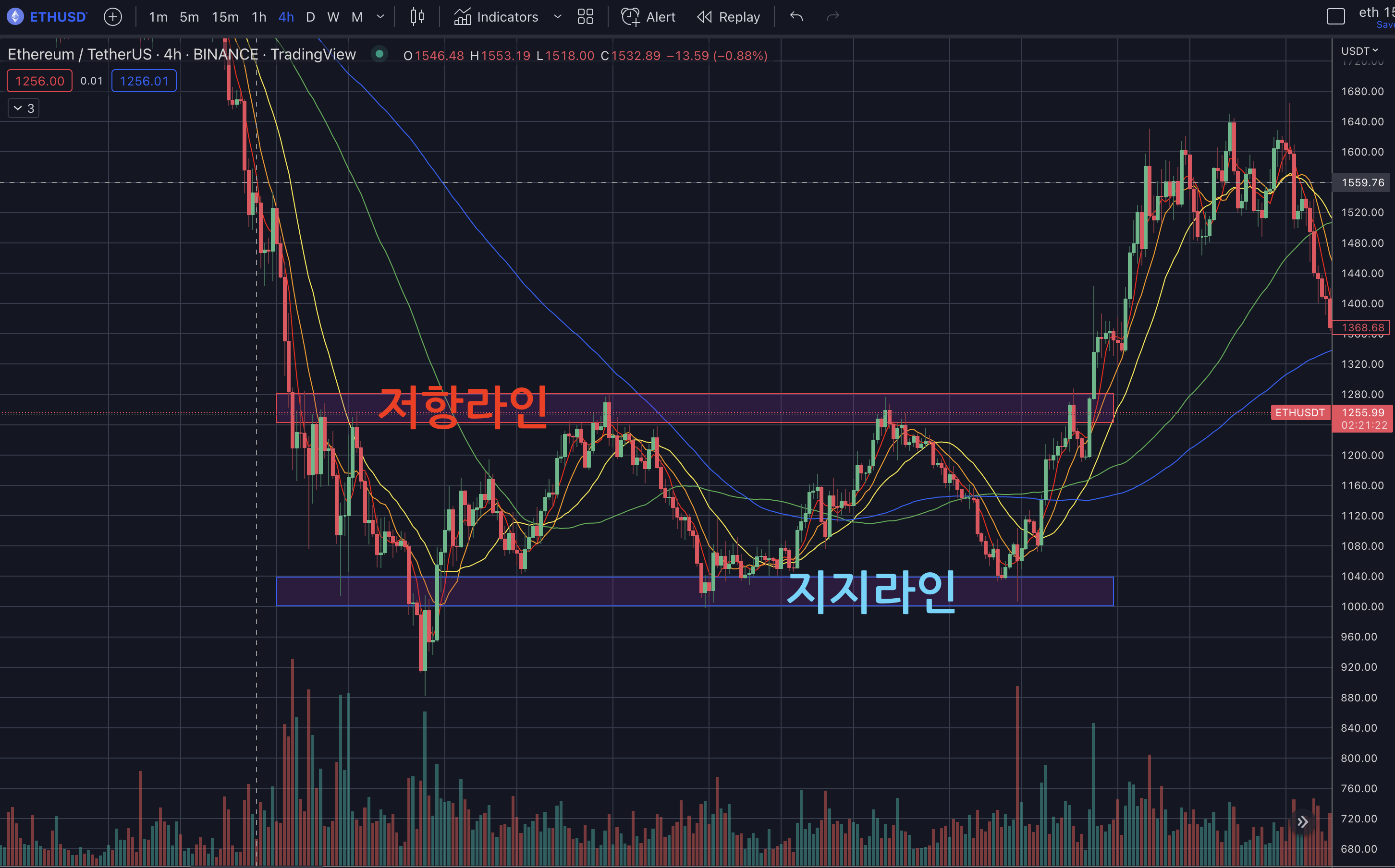 그래서 저 라인을 저항라인이라고 표현하며 이 라인이 중요 타점이 됩니다.