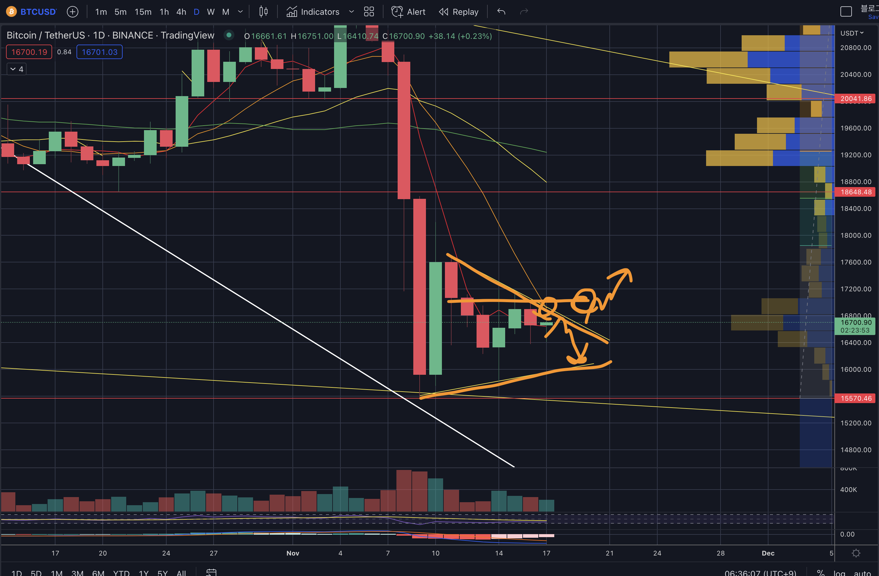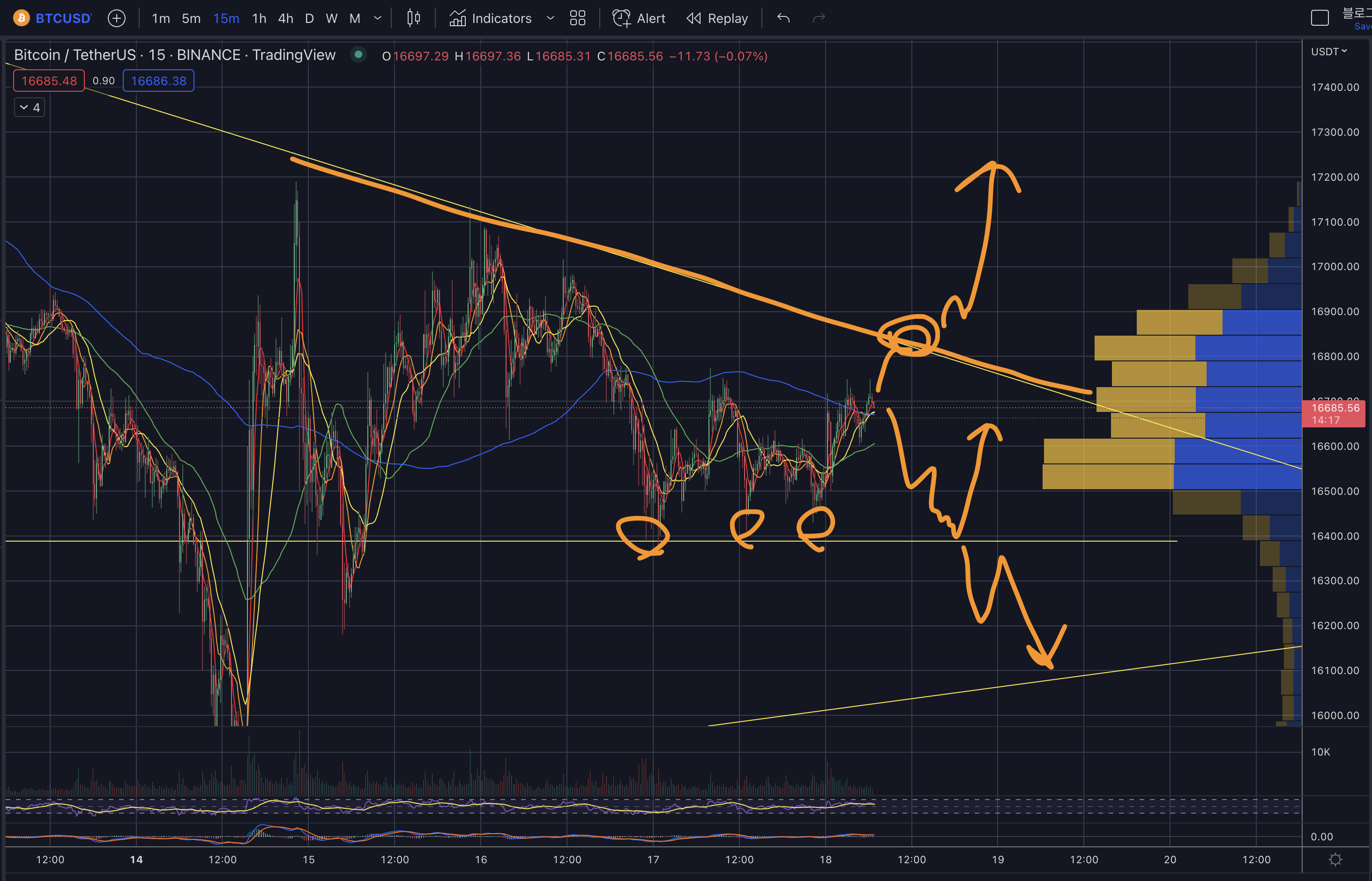 - 16.4k가 단기적 지지를 보여주고 있으며 위로는 고점이 낮아지고 있습니다.