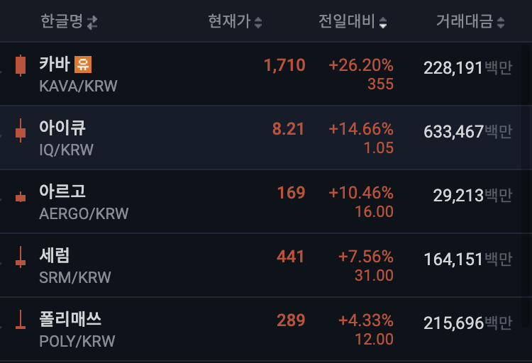 - 카바,아이큐,아르고 등의 비메이저 코인들이 급상승을 이루고 있습니다.