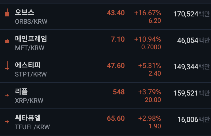 업비트 전일 대비 상위 종목