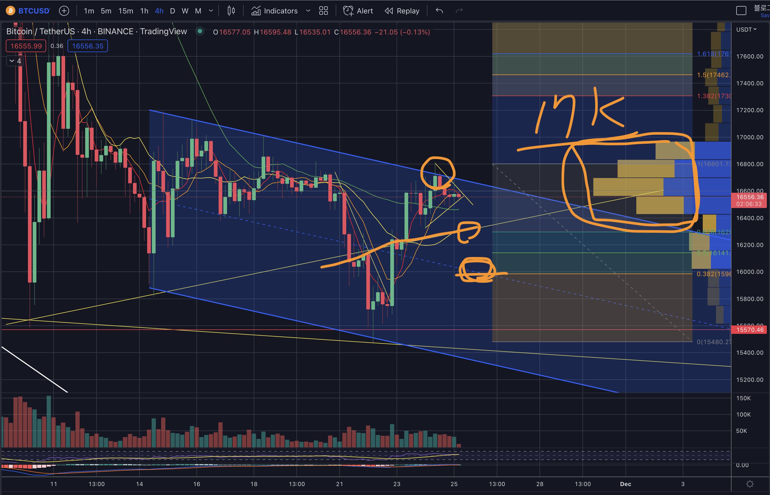 - 내린다면 하락추세선과 하락채널의 중단과 이번 상승의 피보나치 0.382부근인 16k부근이 깨진다면 리스크 관리를 해야합니다.