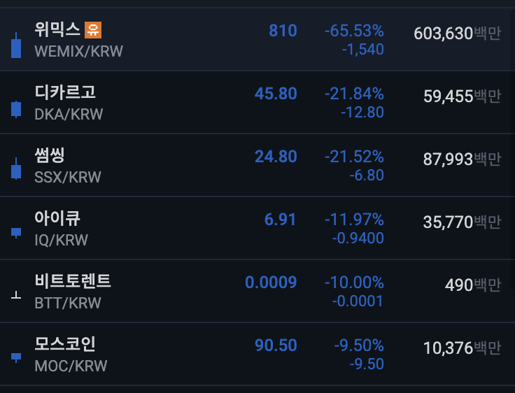 업비트 전일 대비 하위 종목