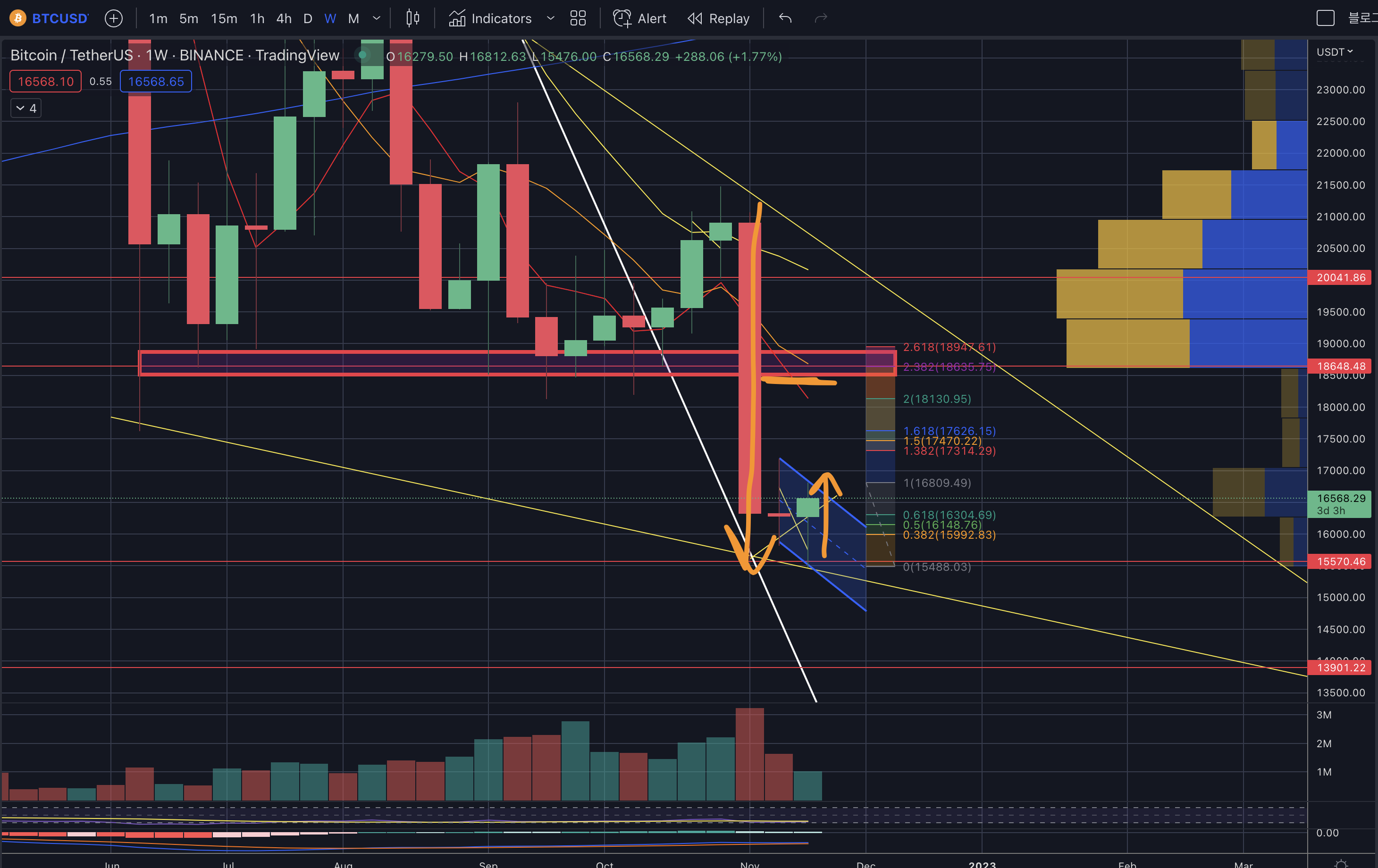 - 아직 완전한 상승은 18.6k를 넘어서야 FTX사태에 대한 하락을 메꿀수 있는 최소한의 라인이라고 생각합니다.