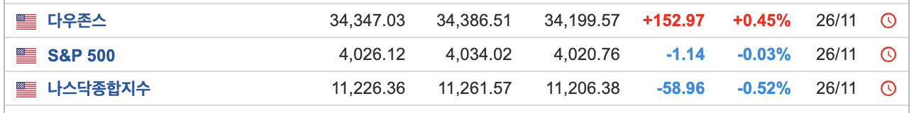 - 다우존스는 상승, 그외는 하락흐름을 보였습니다.