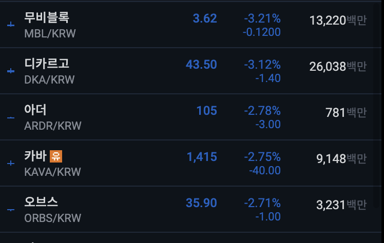 업비트 전일 대비 하위 종목