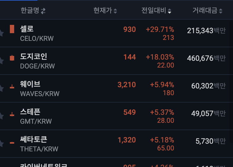 - 셀로, 도지코인, 웨이브가 좋습니다. 도지코인은 특히 흐름이 좋습니다.