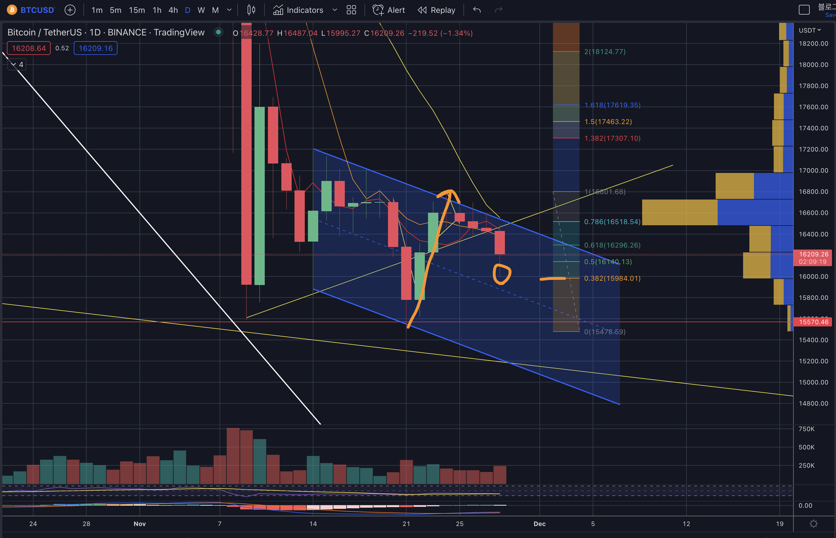 - 하락체널패턴형태를 이루고 있고 상단을 뚫지 못하고 피보나치 0.382부근인 16k를 찍고 살짝 올라와 있습니다.