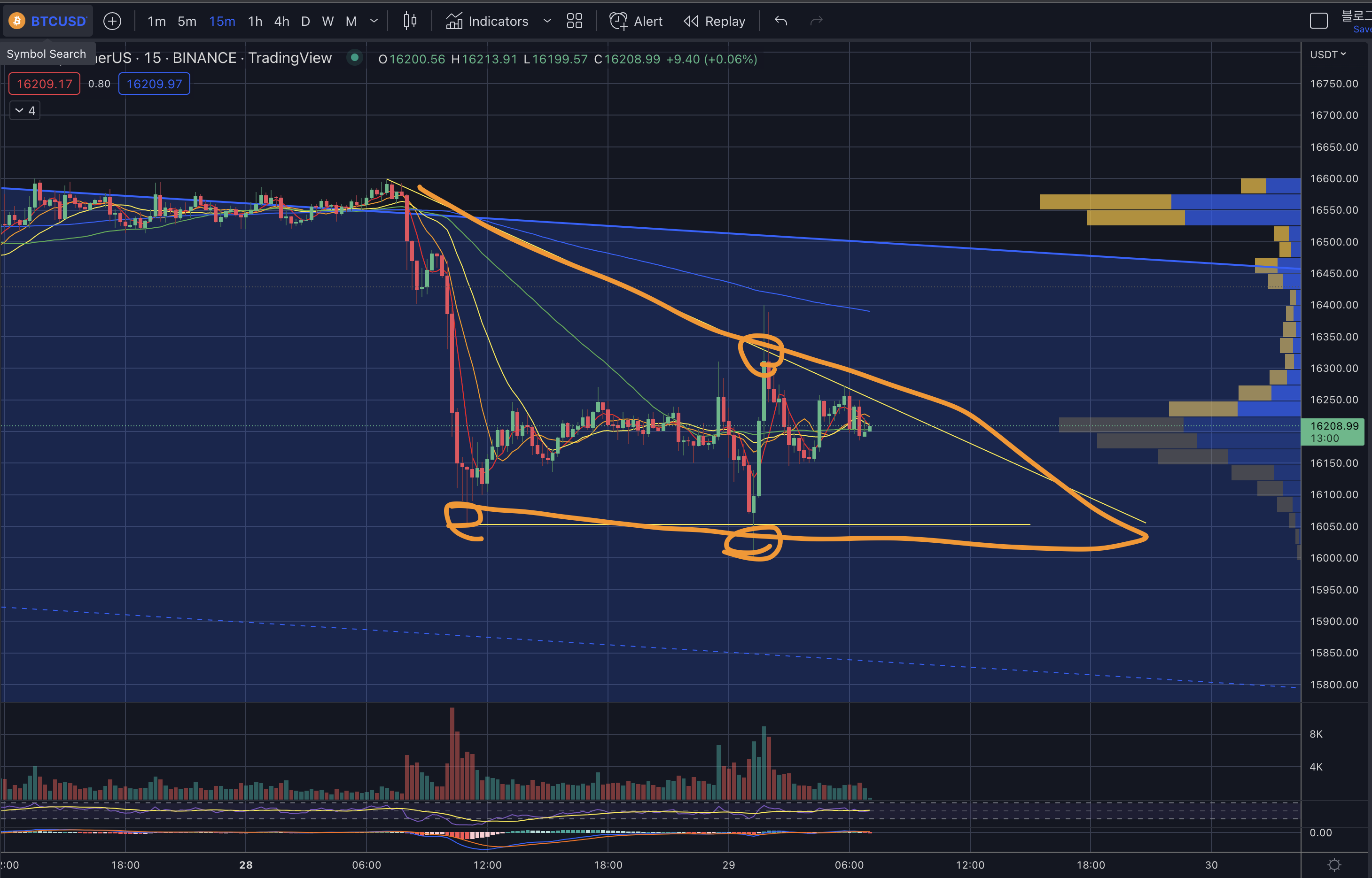 - 16k를 벗어날 때 조심하고 단기적으로 상단추세선을 돌파할때 살짝 SL걸고 롱포지션 잡아볼 수 있습니다.
