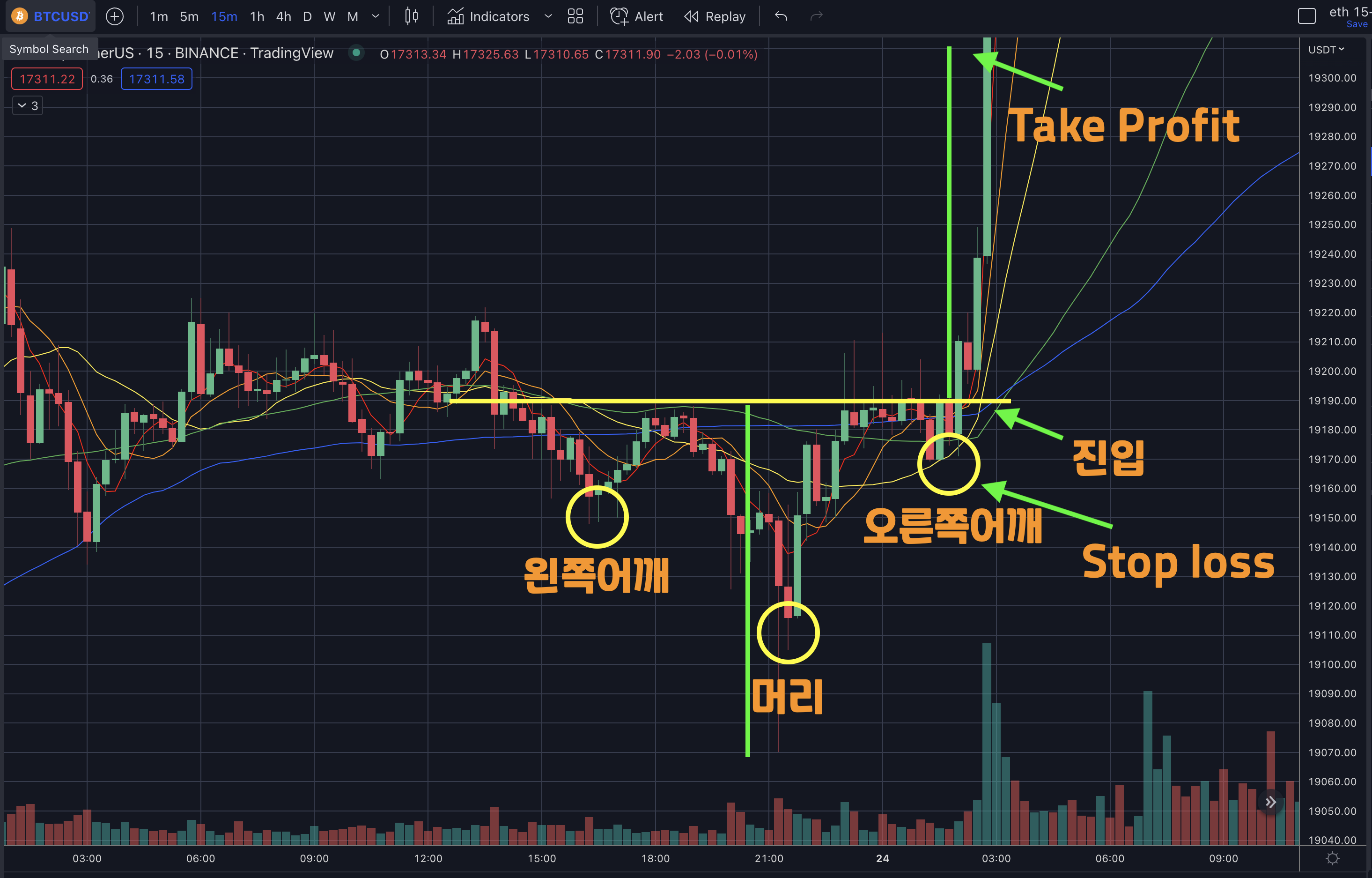 Stop loss는 진입하고 오른쪽어깨에 걸어 놓고 Take Profit은 머리와 넥라인 길이를 넥라인 위로 길이를 설정하면 됩니다.