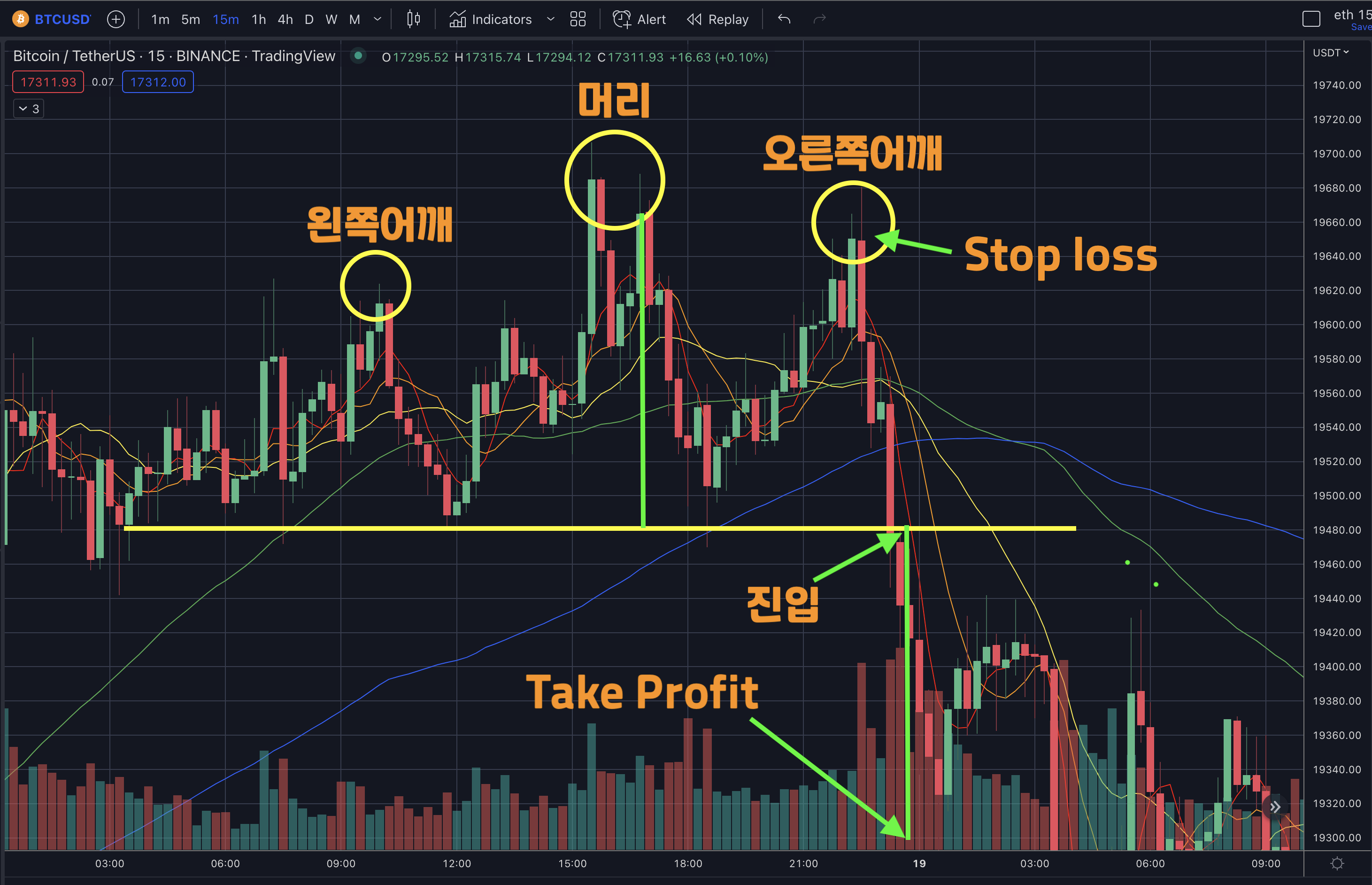TP(Take Profit)은 지점은 넥라인과 머리의 길이와 같게 한다음 아래로 쭉 내리면 TP자리가 나옵니다.