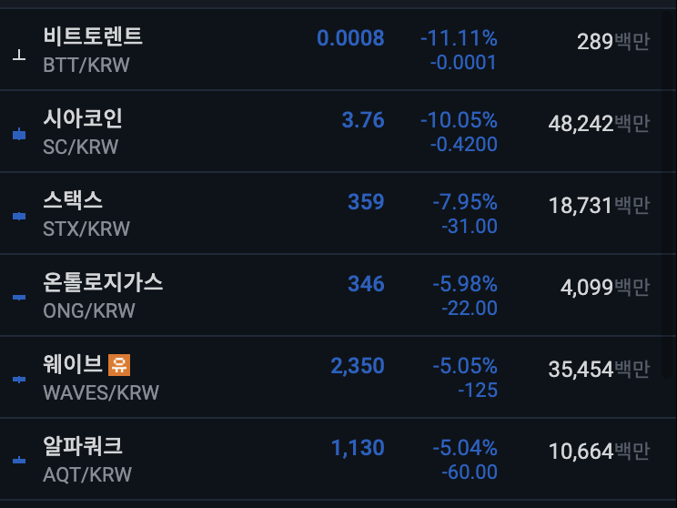 업비트 전일 대비 하위 종목