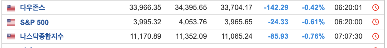 - 금리 예정대로 50bp인상함에 따라 3대지수모두 하락 마감(큰폭으로 떨어지지 않았음)