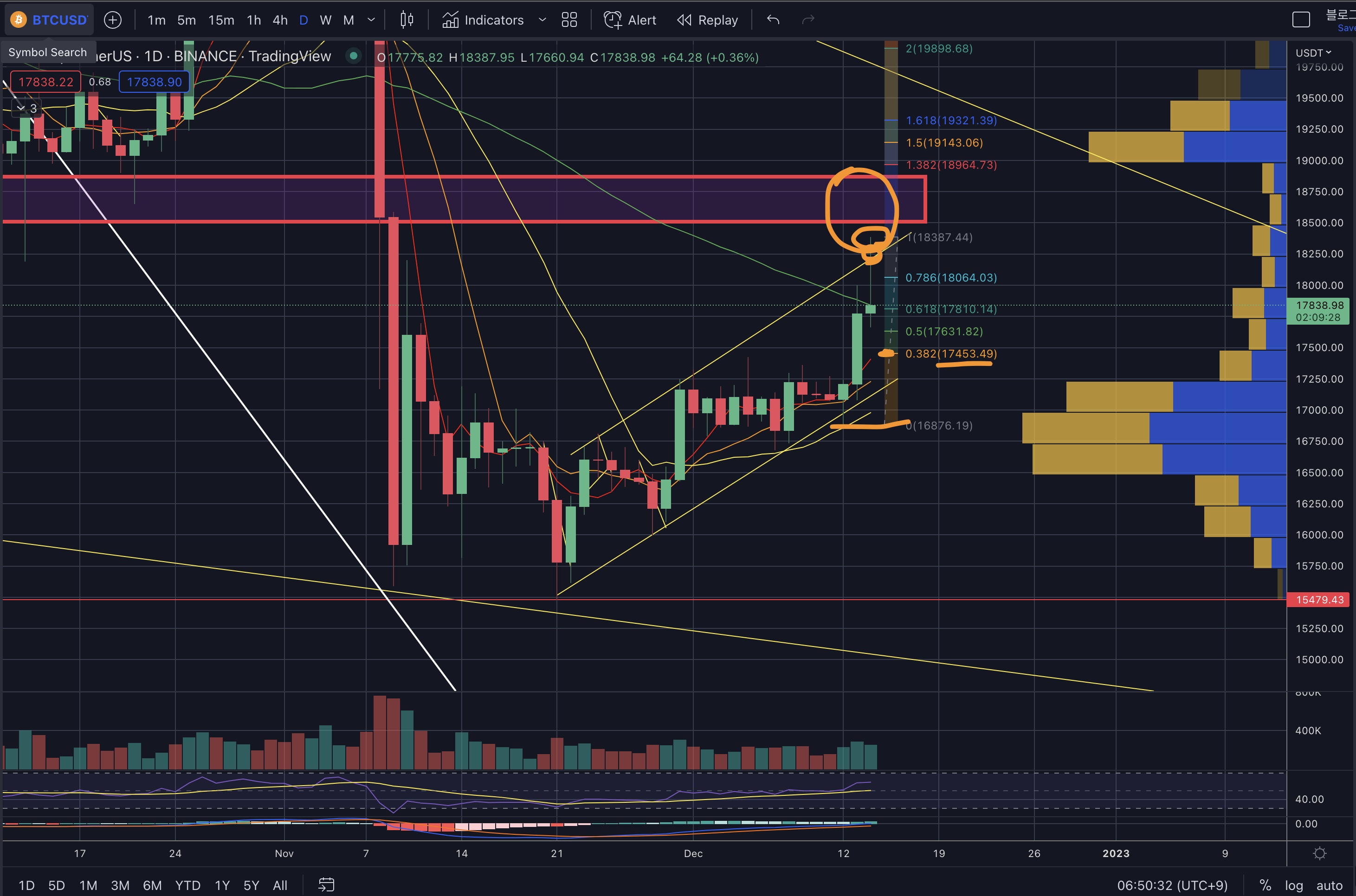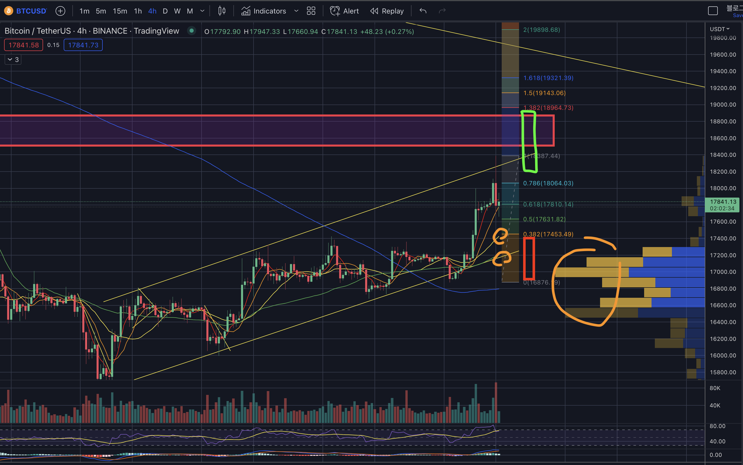- 단기적으로 3일전 상승과 오늘까지 상승분의 피보나치를 그려보면 0.382부근 17.4k이 1차저항