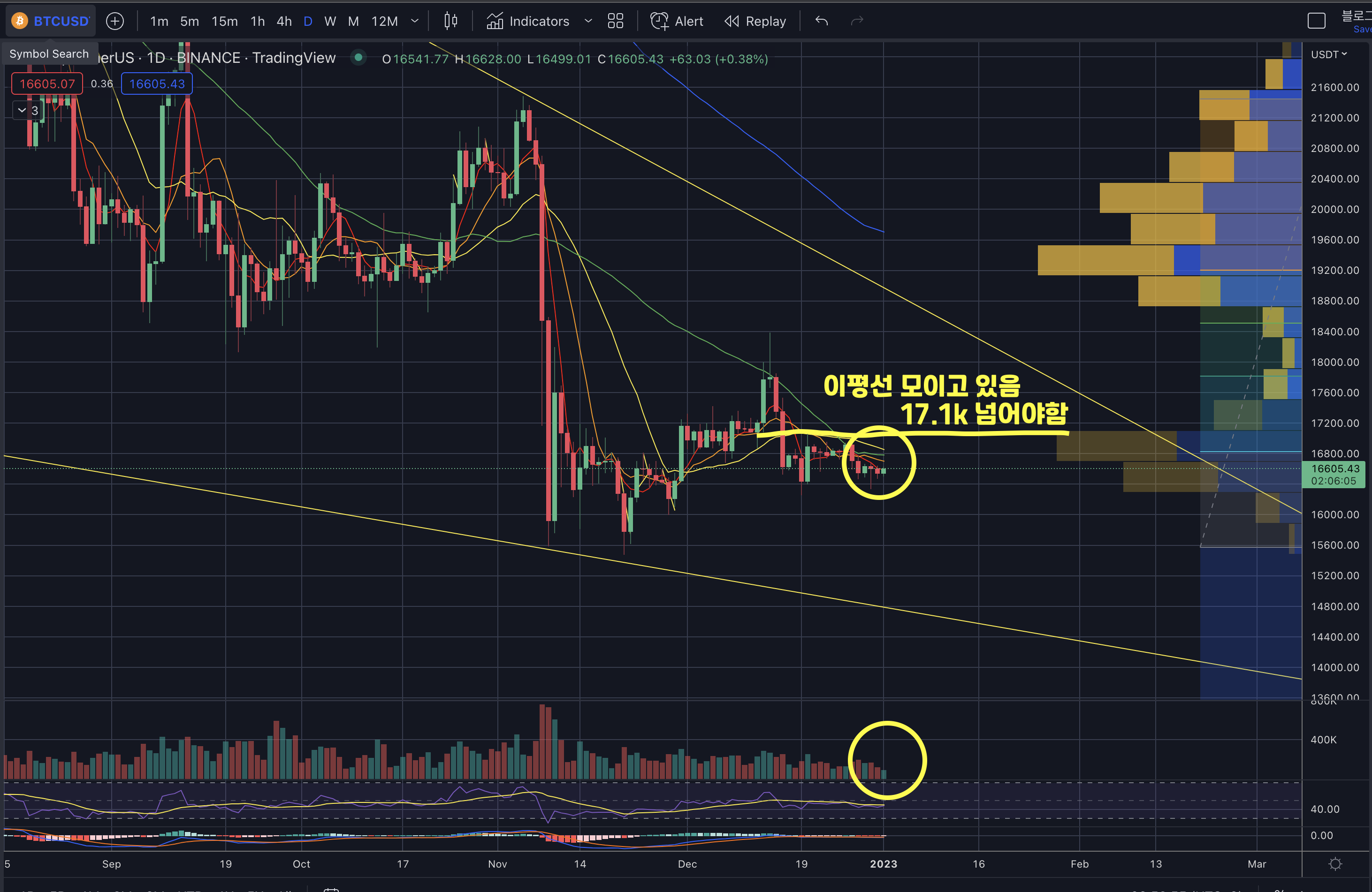 - 오르려면 17.1k를 거래량을 포함해 올라야 하고 내린다고 하면 16.3k가 시간봉 마감하는 지 잘 봐야합니다.