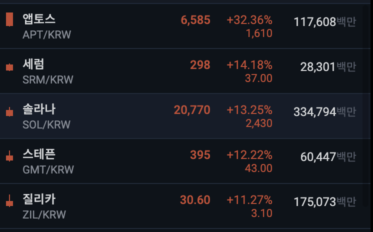 - 앱토스, 세럼, 솔라나, 스테픈, 질리카가 흐름이 좋습니다.