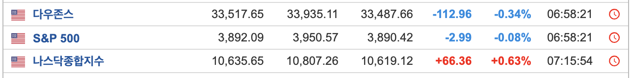 - 다우존스와 S&P500은 하락 나스닥은 상승 마감하였습니다.