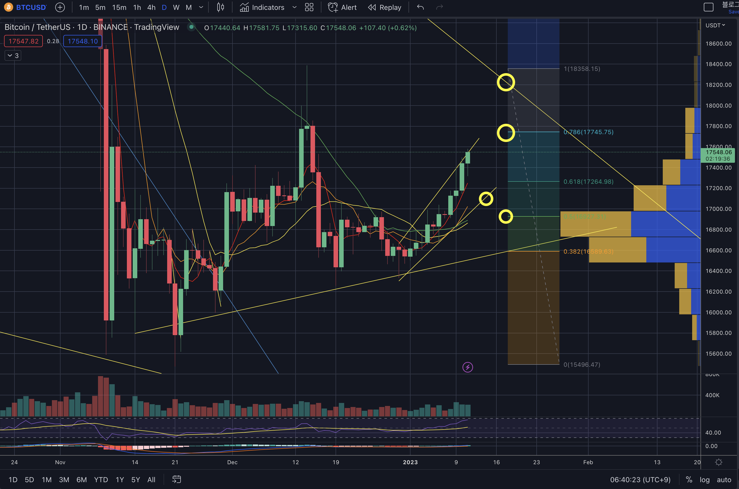 - 피보나치 전고점과 15.4k를 연결한 0.786 부근인 17.7k가 1차 저항이고 18.3~4k가 2차저항입니다.
