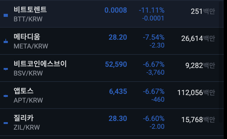 - 메타디움, 비트코인에스브이, 앱토스가 흐름이 좋지 않습니다.