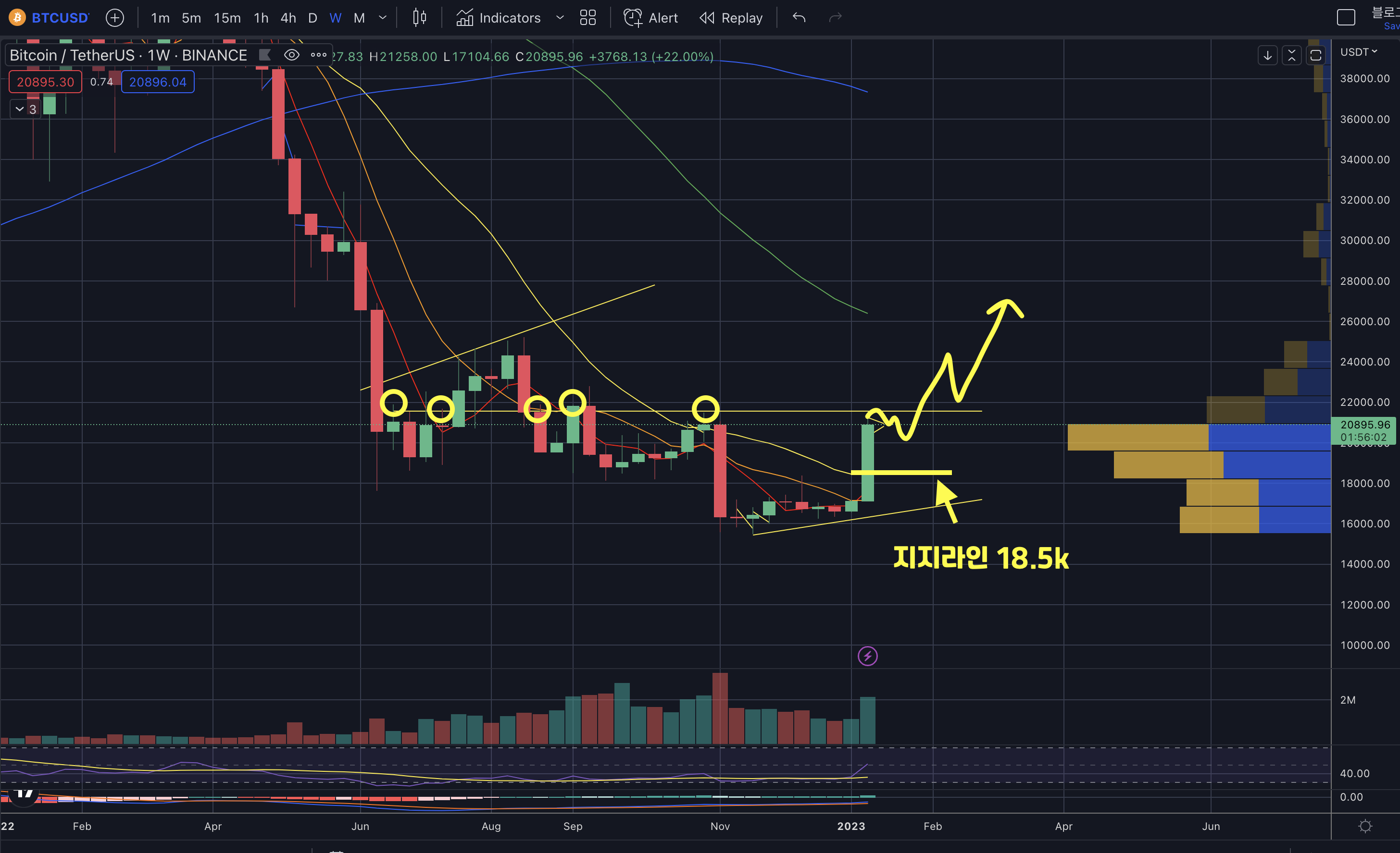 - 21.5k부근은 여러번 저항 및 지지를 받았던 구간입니다.