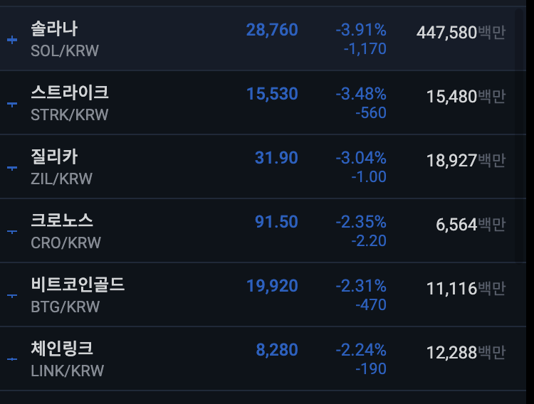 업비트 전일 대비 하위 종목