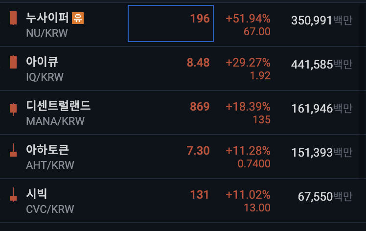 업비트 전일 대비 상위 종목