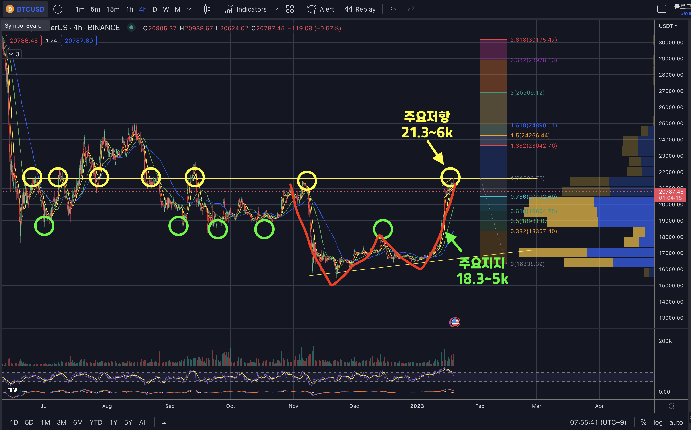 - 하지만 떨어진다면 1차저항 피보나치 0.618자리와 중간 매물대자리인 19.5~6k입니다.
