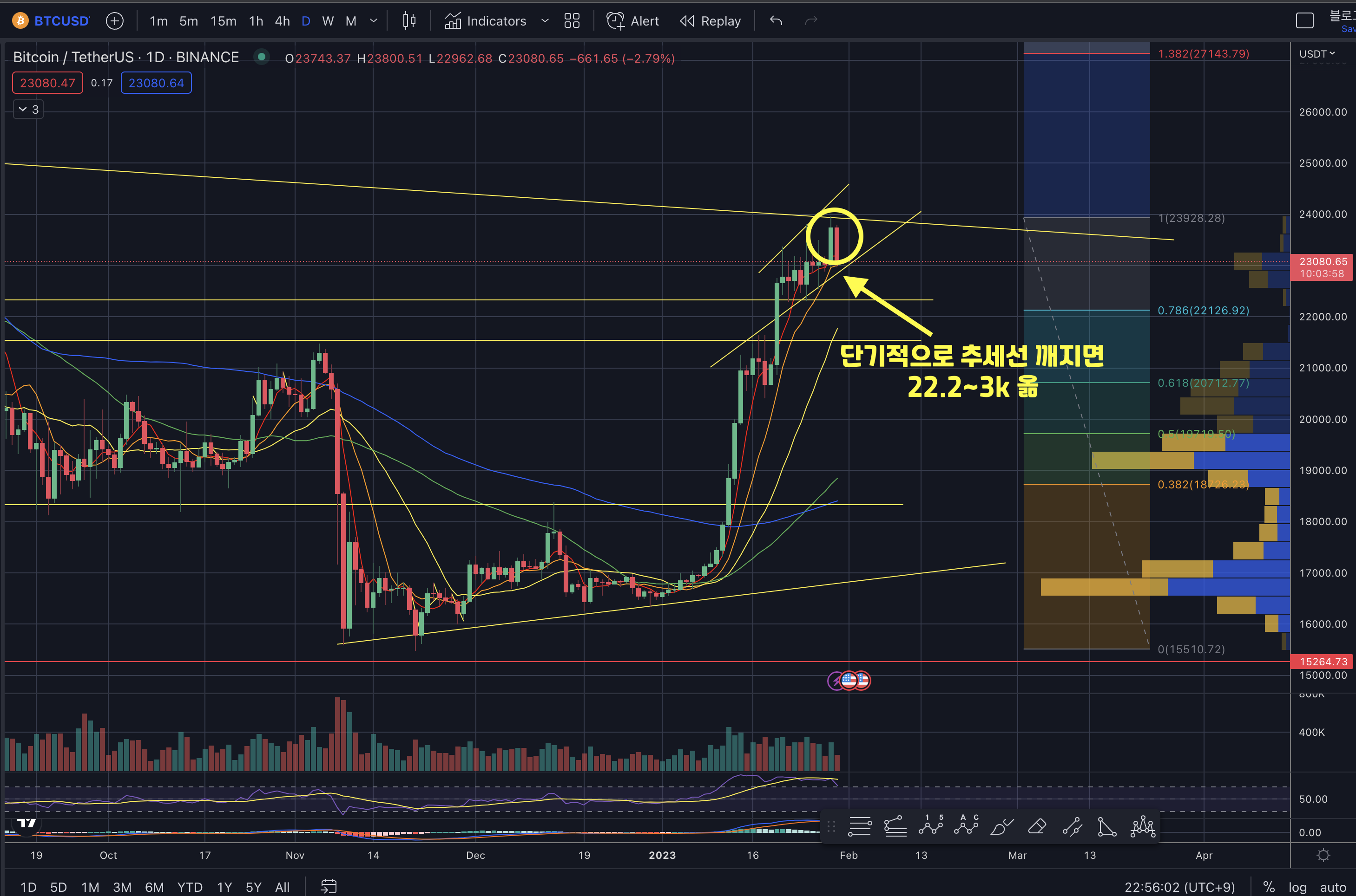 - 단기추세선인 22.8~9k를 깨게 되면 22.2~3k까지 급하게 깨질 수 있으니 조심하세요.