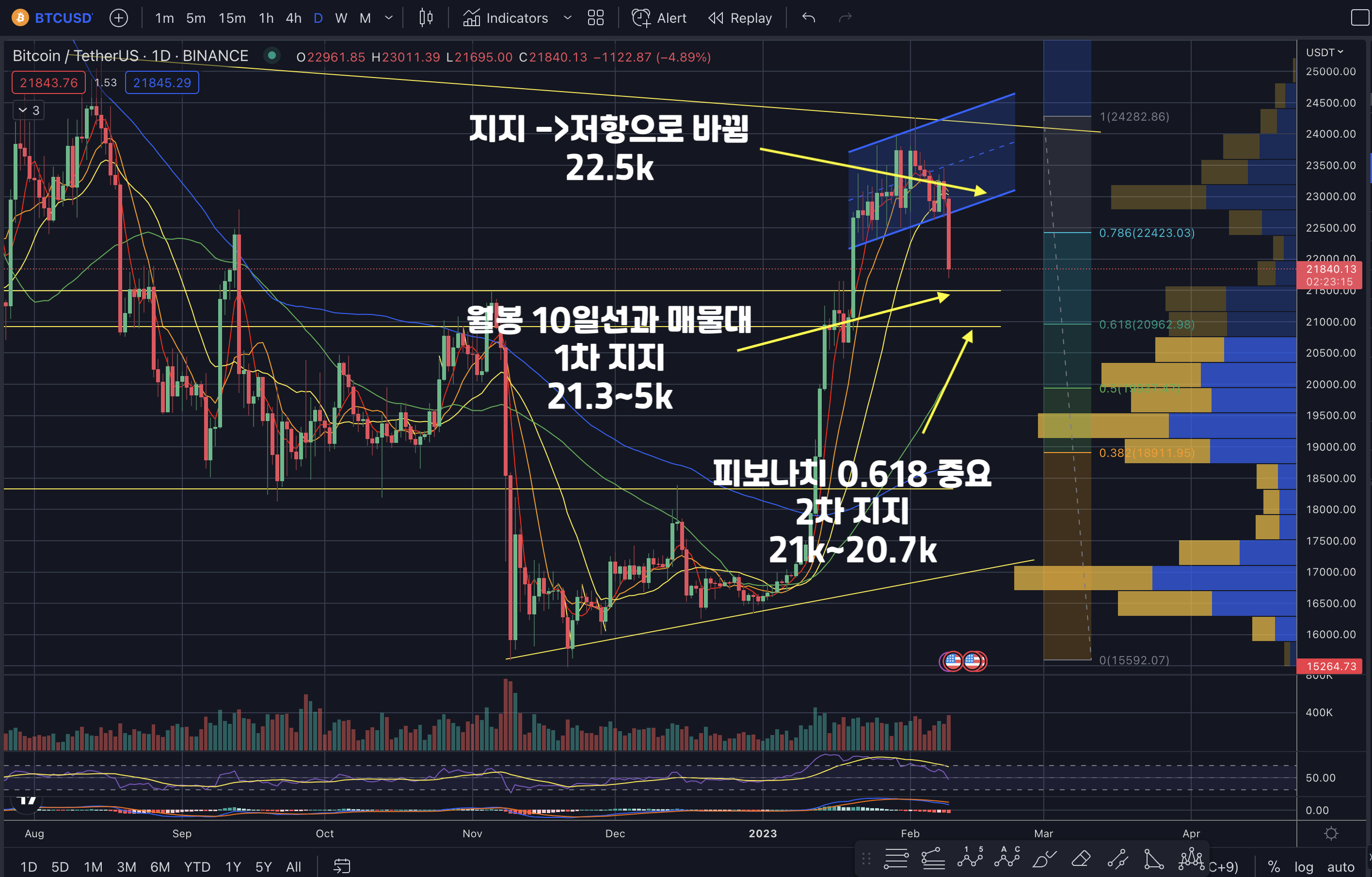[비트코인시황] 23.02.09(목) | 다시 3%하락 | 주봉 5일선 이탈시 조심