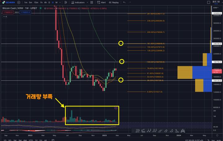 비트코인캐시는 전체적으로 비트코인의 흐름을 따라가긴 하지만 여타 다른 코인들과는 들이 힘을 좀 못내주고 있는 것이 현실입니다. 전반적으로 거래량이 부족하기 때문에 아직까지는 확오르기에는 아쉬운 부분입니다. 15만원라인을 지켜주는 것이 가장 중요한 포인트입니다. 여기가 뚫리게 되면 다시한번 암흑으로 갈 수 있 수 있습니다.