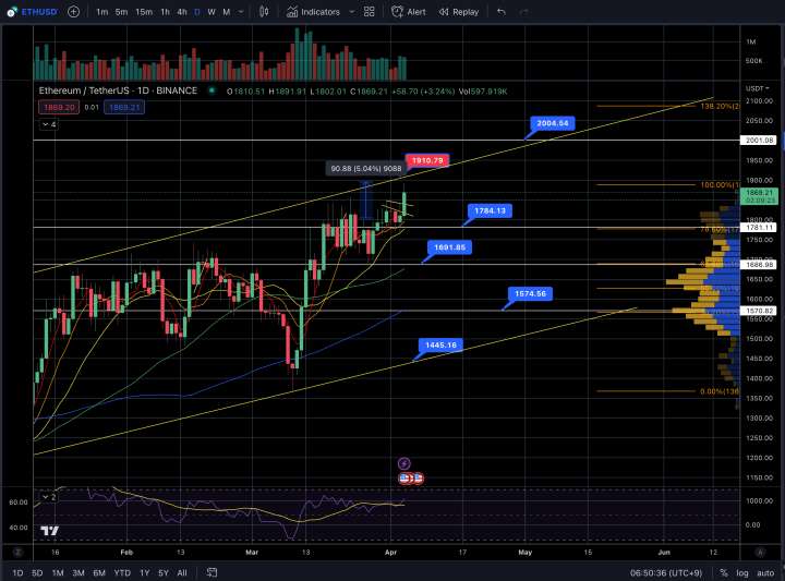 드디어 이더리움이 비트코인 형님의 눈치를 보고 있다가 확 올라주는 상승을 보여줬습니다. 이더리움은 비트코인과 달리 전고점인 2000을 탈환하지 못했는 데요. 이번 주 확 뚫어주기를 바라봅니다. 현재 이더리움은 상승 채널의 상단에 막혀있으나 바로 2000이 코앞으로 보이며 확 뚫어버리면 더 높은 곳까지 갈 수 있을 듯 합니다. 하지만 4월 12일 상하이 업그레이드가 남아있기 때문에 항상 조심해야합니다.