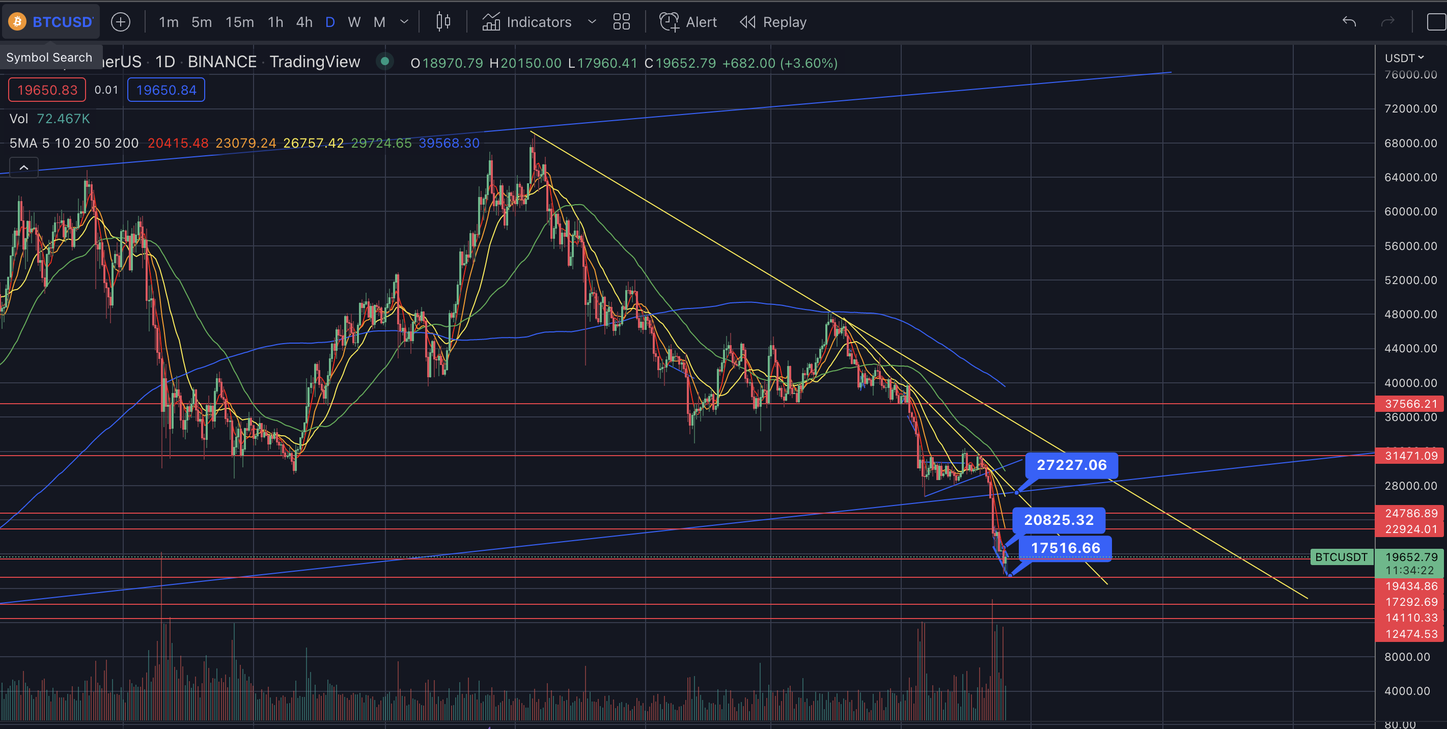 - 장기적으로 봤을 때 70k부터 17k까지 빠진 #하락추세선까지는 상승으로 보기엔 어렵다.