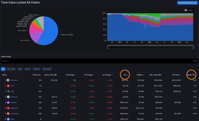MCap/TVL 지수를 보면 시총대비 TVL지수를 말하는 데요. 즉 그 코인이 얼마나 락업이 되어 있는지 확인할 수 있습니다.