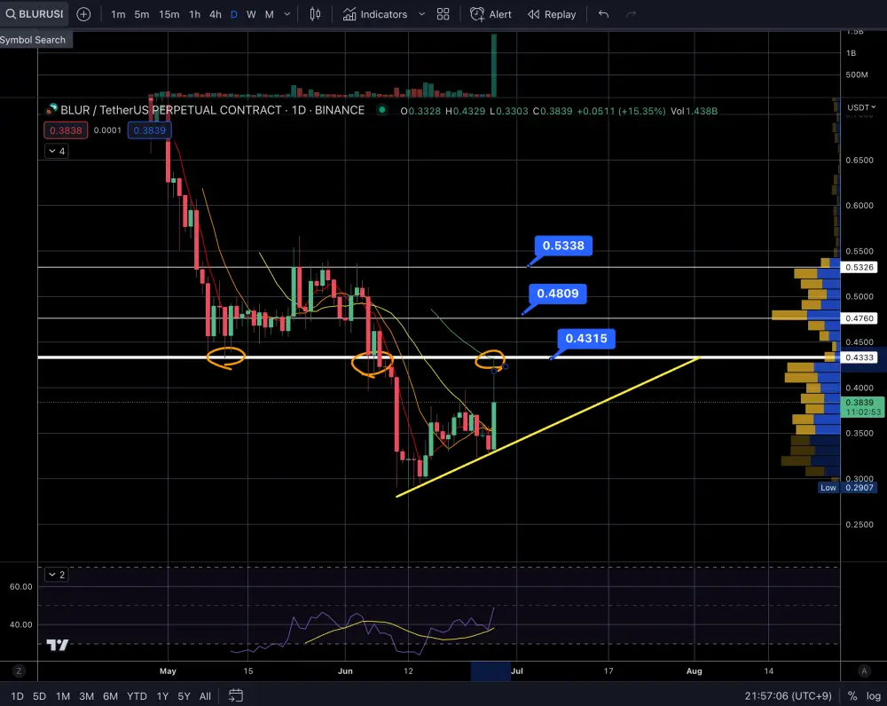 블러는 아직 업비트에 방금 상장되었기도 하고 바이낸스도 많은 차트가 그려지지 않았기 때문에 정확하지 않습니다. 단기적으로 저항과 지지를 받았던 0.43라인을 돌파한다고 하면 흐름은 다시 상승 추세로 바뀔 것입니다. 0.43을 지지하는 것을 보고 들어가도 늦지 않기 떄문에 빨리 진입하시는 것을 추천드리지 않습니다.