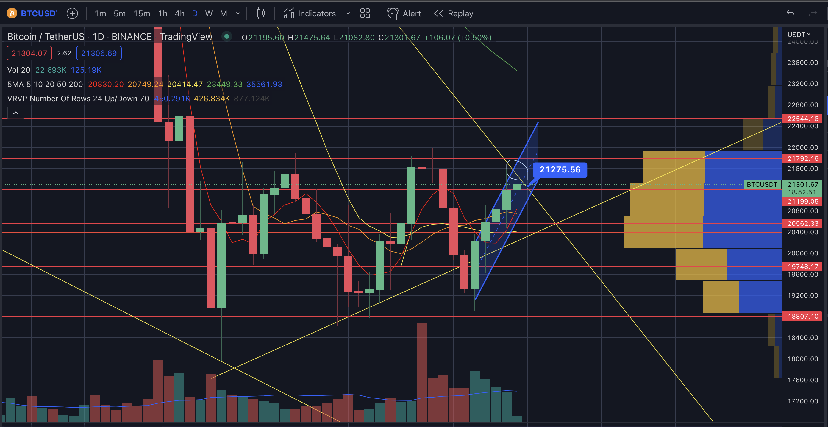 - `21.2`라인을 지켜주고 추세선을 돌파해주면 `24k`까지 가능하다. (아직 완전 상승은 아니다. )